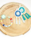 Tous les accessoires sont réalisés avec des perles en bois de hêtre naturel pas traité, certifiées PEFC et provenant de forêts Françaises durablement gérées. Certaines sont crochetées avec du coton 100% Oeko-Tex. Des perles en silicone alimentaire sans bisphénol A (BPA) et sans métaux lourds sont également utilisés.
