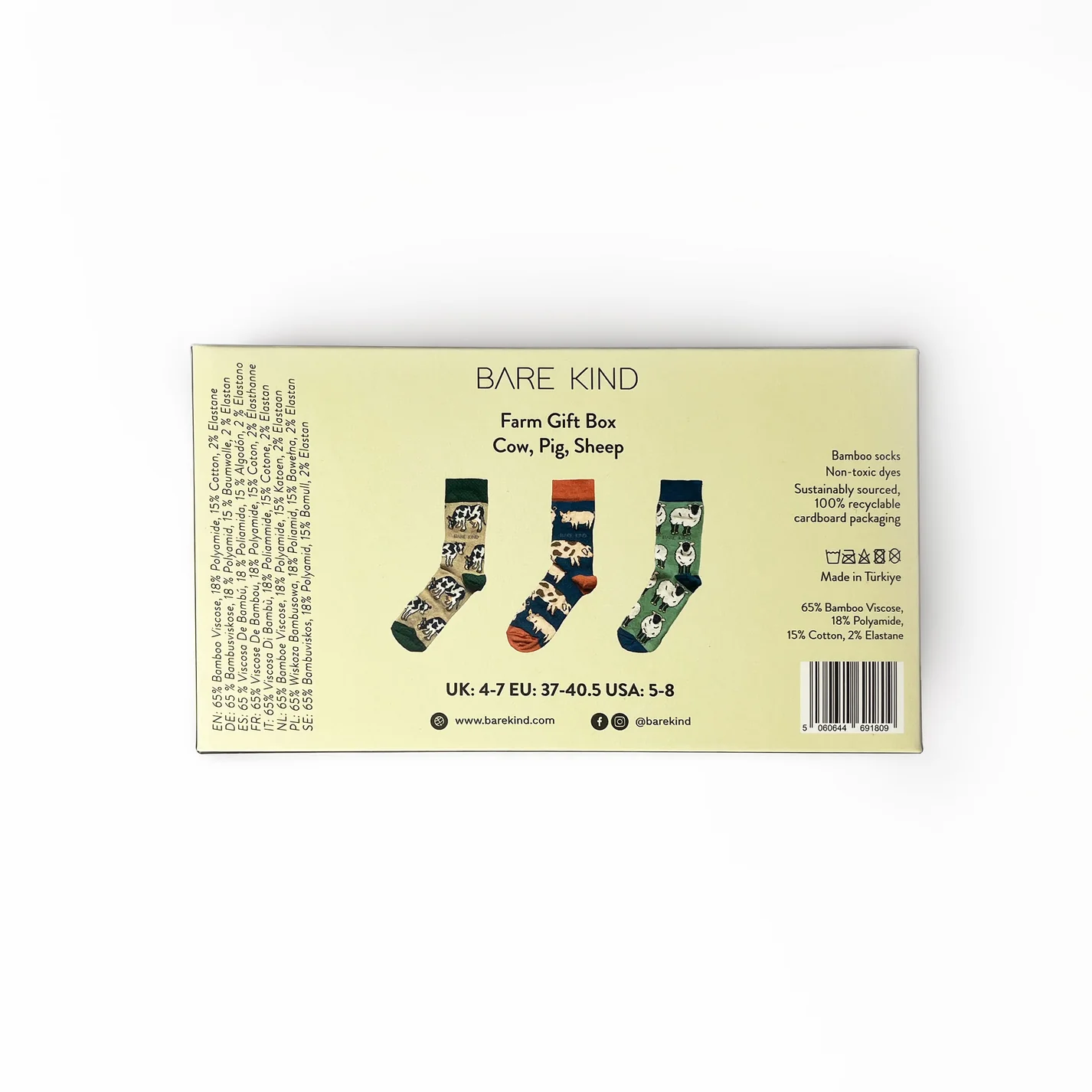La fibre de bambou utilisée par Bare Kind est de haute qualité, douce, évacue la transpiration et régule la température. Leurs chaussettes proviennent d’une usine familiale de troisième génération située à Istanbul, sont fabriquées avec des fibres certifiées OEKO-TEX et sont emballées dans du carton certifié FSC.