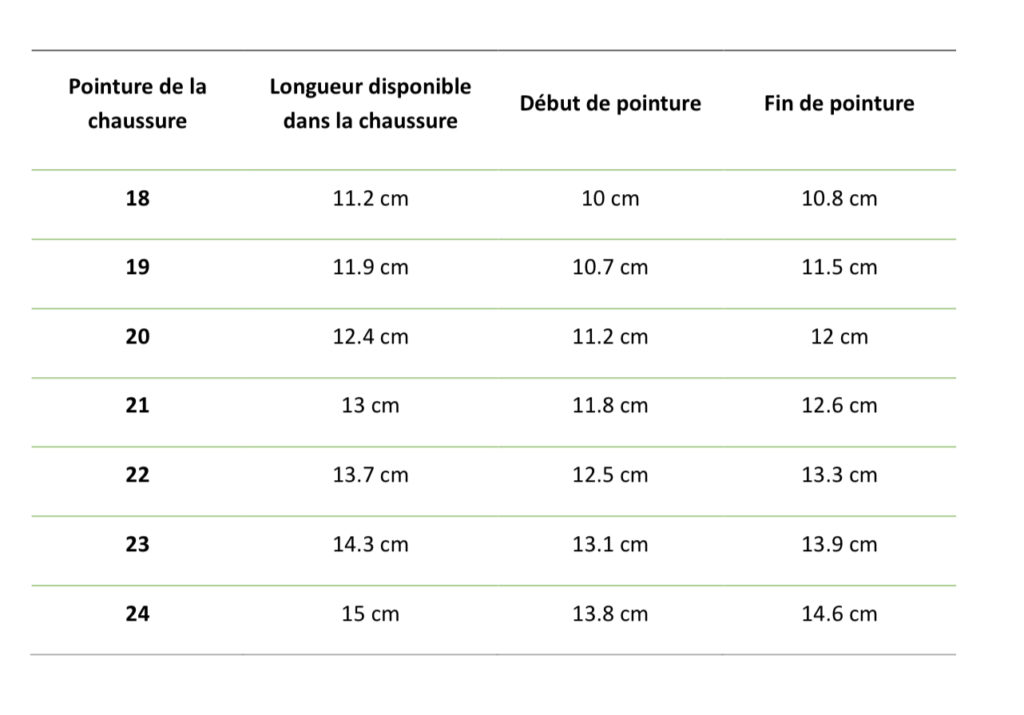 Pour savoir quelle pointure choisir il est necessaire de mesurer le pied de votre enfant bien au plat au sol. La longueur correspond aux mesurer du talon à l’orteil le plus long, et la largeur à la mesure entre les deux métatarses (les os sous les orteils). une marge entre 0,8 et 1,2 cm est préférable car elle considère la marge pour le bon déroulement du pied pendant la marche et la marge de croissance.