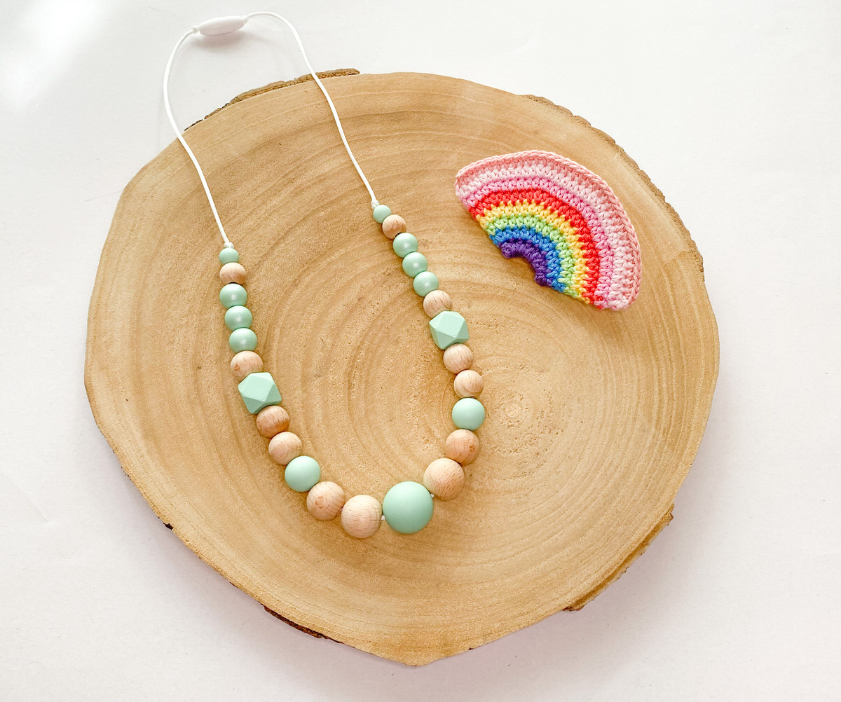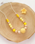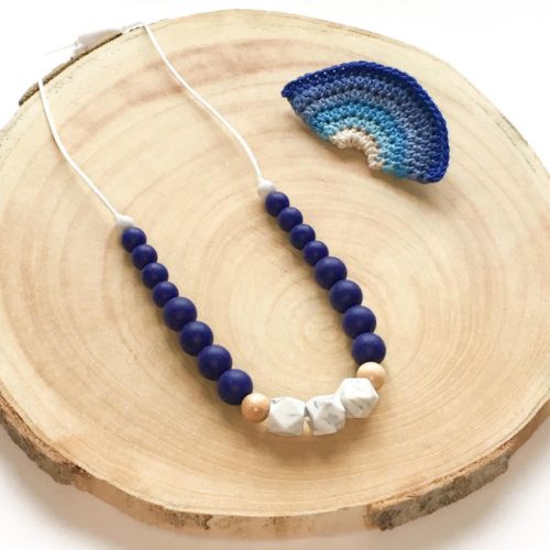 Collier de dentition, d’allaitement ou de portage, il stimule les sens du bébé et attire son attention.