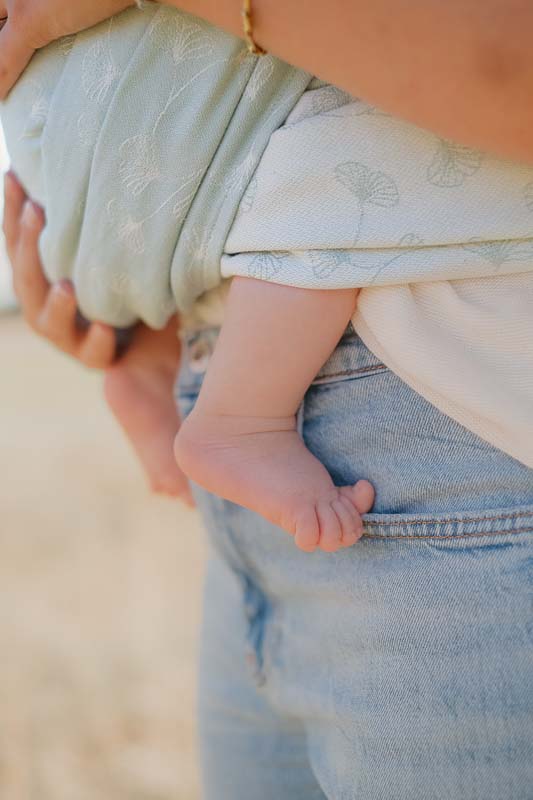Avec un grammage de 235g/m2, cette écharpe convient pour un portage ventral, sur la hanche ou sur le dos. Elle peut être lavée en machine à 30C (je déconseille l’utilisation d’assouplissant et de sèche- linge). Je vous recommande de laver l’écharpe avant la première utilisation.