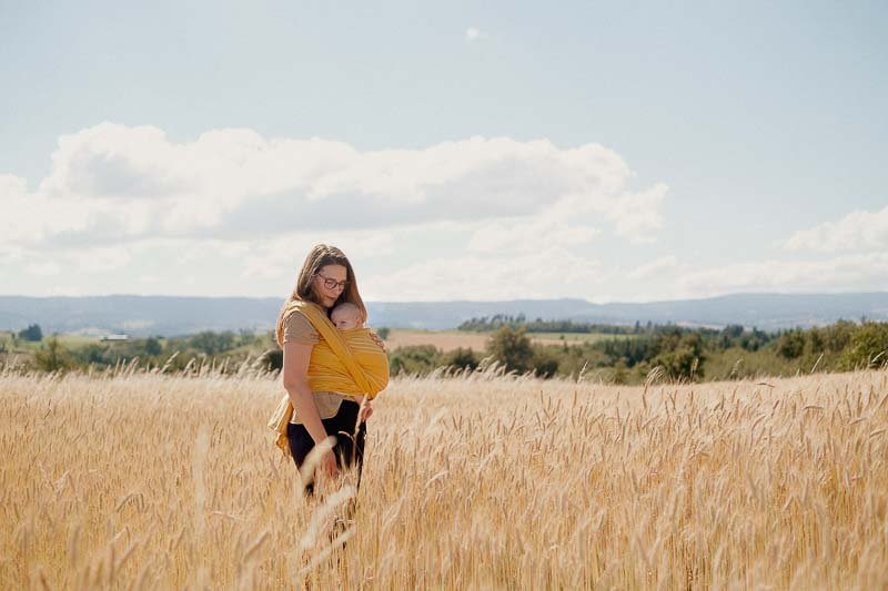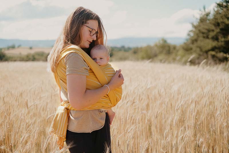 Avec un grammage de 235g/m2, cette écharpe convient pour un portage ventral, sur la hanche ou sur le dos. Elle peut être lavée en machine à 30C (je déconseille l’utilisation d’assouplissant et de sèche- linge). Je vous recommande de laver l’écharpe avant la première utilisation.